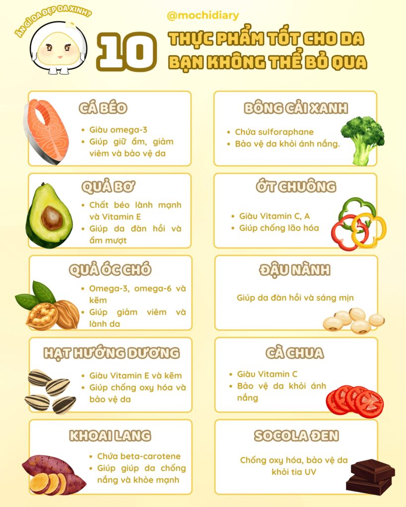 Chế độ ăn uống đóng vai trò quan trọng trong việc duy trì làn da khỏe mạnh, căng mịn và trẻ trung. Bằng cách bổ sung các thực phẩm tốt cho da vào chế độ ăn hằng ngày, bạn không chỉ giúp làn da luôn tươi sáng mà còn cải thiện sức khỏe tổng thể. Dưới đây là 10 loại thực phẩm tốt nhất cho da mà bạn và Mochi không nên bỏ qua.