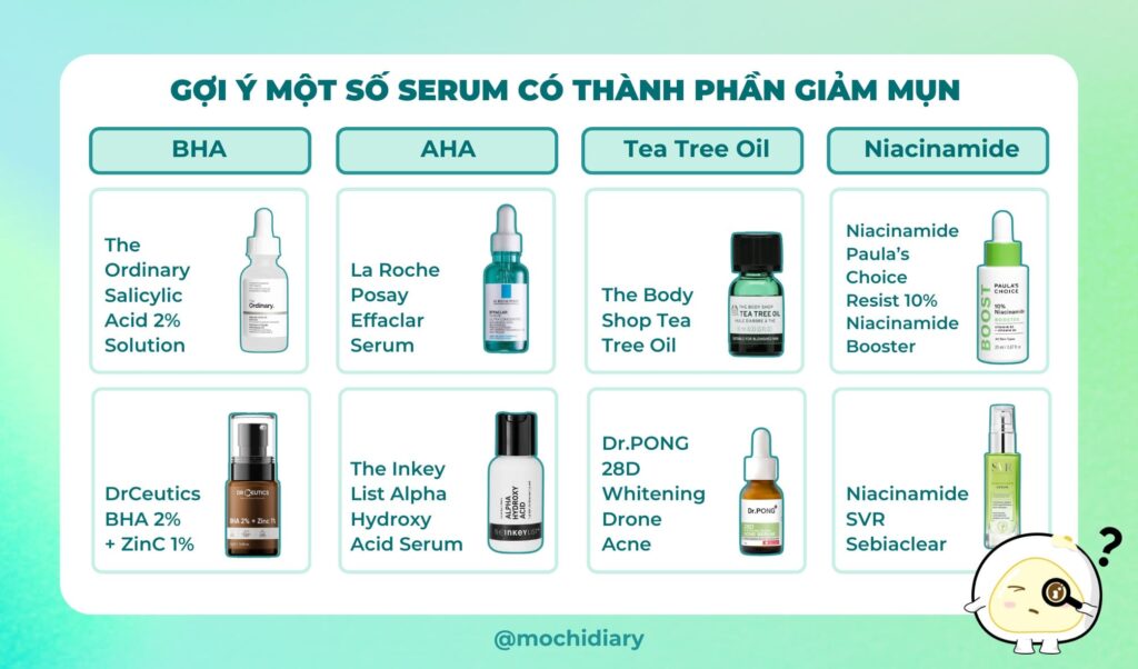 Serum là bước không thể thiếu để trị mụn hiệu quả vì kết cấu lỏng dễ thẩm thấu và không gây bí da, bạn có thể tìm kiếm các sản phẩm chứa các thành phần sau: Salicylic acid, AHAs, Tea Tree Oil, Niacinamide, Peptides,…Các thành phần này thâm nhập sâu vào da, cải thiện tình trạng da, giúp làm sạch lỗ chân lông và giảm tình trạng viêm.