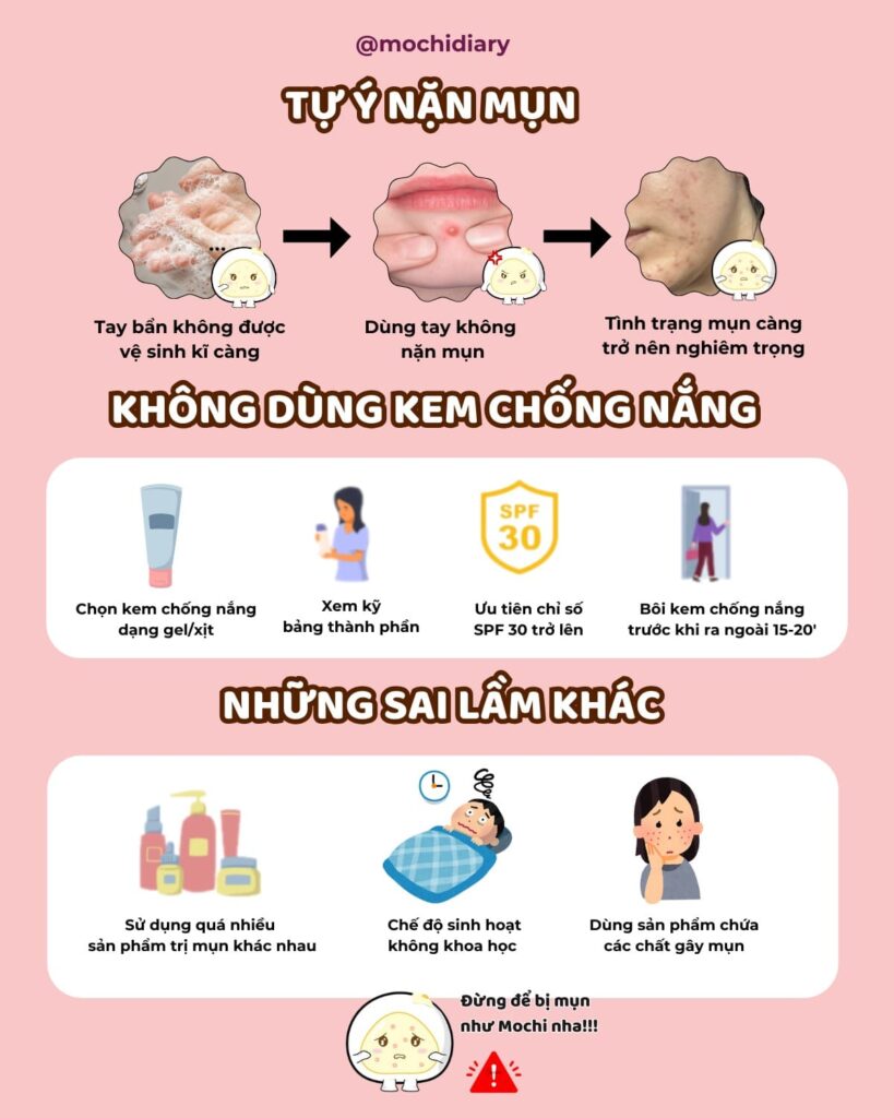 Dẫu biết việc da mặt đầy ắp mụn là cực kỳ khó chịu nhưng thói quen soi gương và nặn mụn tay trần là một sai lầm nghiêm trọng mà nhiều người mắc phải. Tay chúng ta tiếp xúc với vô số bề mặt bẩn mỗi ngày, mang theo hàng triệu vi khuẩn có hại. Khi dùng tay không chạm vào mụn như vậy, bạn đang tạo điều kiện cho vi khuẩn xâm nhập sâu vào da, gây viêm nhiễm và làm tình trạng mụn trở nên tồi tệ hơn.