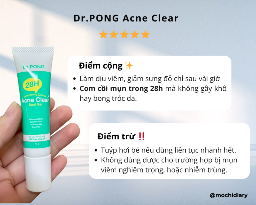 Trên đây là top 5 tuýp kem trị mụn tốt nhất được nhiều người dùng và chuyên gia da liễu đánh giá cao. Nếu bạn đang tìm kiếm giải pháp vừa giảm mụn nhanh, vừa dịu nhẹ với cả làn da nhạy cảm. Dr.PONG 28H Whitening Drone Acne Clear Spot là lựa chọn đáng cân nhắc, giúp giảm sưng trong vài giờ, gom cồi chỉ sau 28h mà không để lại thâm.