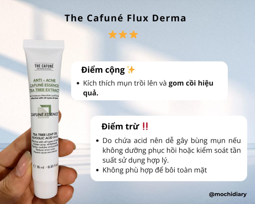 Tương tự Artiderm, gel trị mụn Cafuné Flux Derma cũng chứa các hoạt chất mạnh, nhưng sản phẩm này thiên về gom cồi mụn và cải thiện độ mịn bề mặt da. Trong những ngày đầu sử dụng, gel có thể kích thích nhân mụn trồi lên để đẩy dần ra ngoài. Tuy nhiên, nếu không kết hợp dưỡng phục hồi hoặc không kiểm soát tần suất sử dụng hợp lý, da có thể phản ứng dẫn đến bùng mụn (breakout).