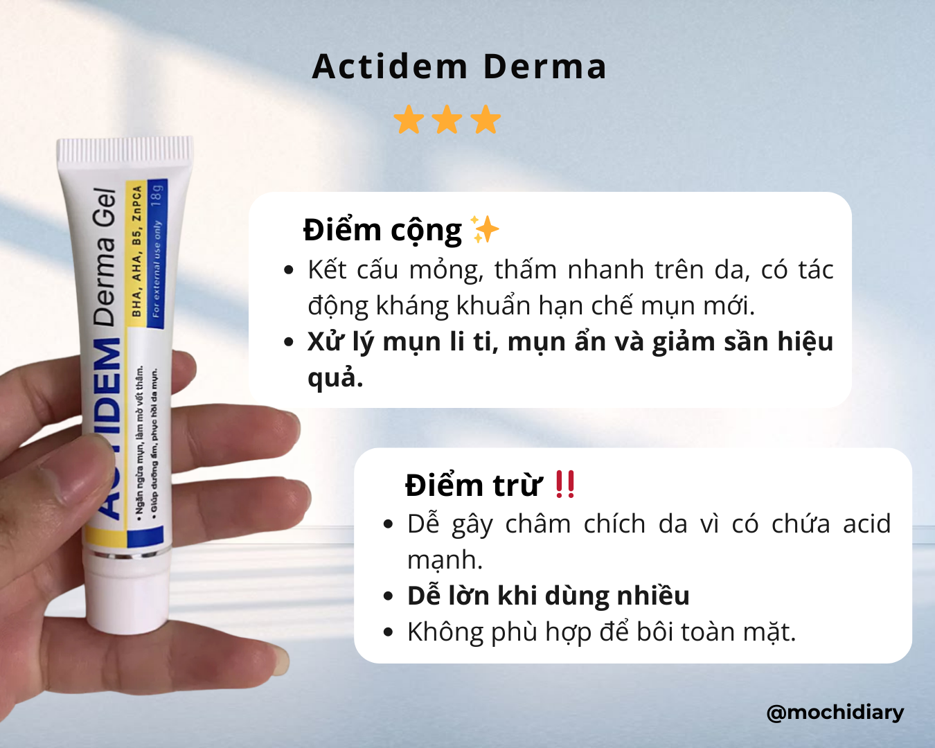 Đối với những làn da có nhiều mụn ẩn có thể lựa chọn gel chấm mụn Actidem Derma với thành phần AHA, BHA giúp kháng khuẩn và giảm sần. Chấm mụn có kết cấu mỏng, thấm nhanh trên da nhưng vì có chứa acid mạnh,khi tác động trực tiếp lên da có thể gây châm chích nhẹ, đặc biệt với da nhạy cảm. Vì vậy, nên test trên một vùng nhỏ và sử dụng cách ngày khi mới bắt đầu để da làm quen.