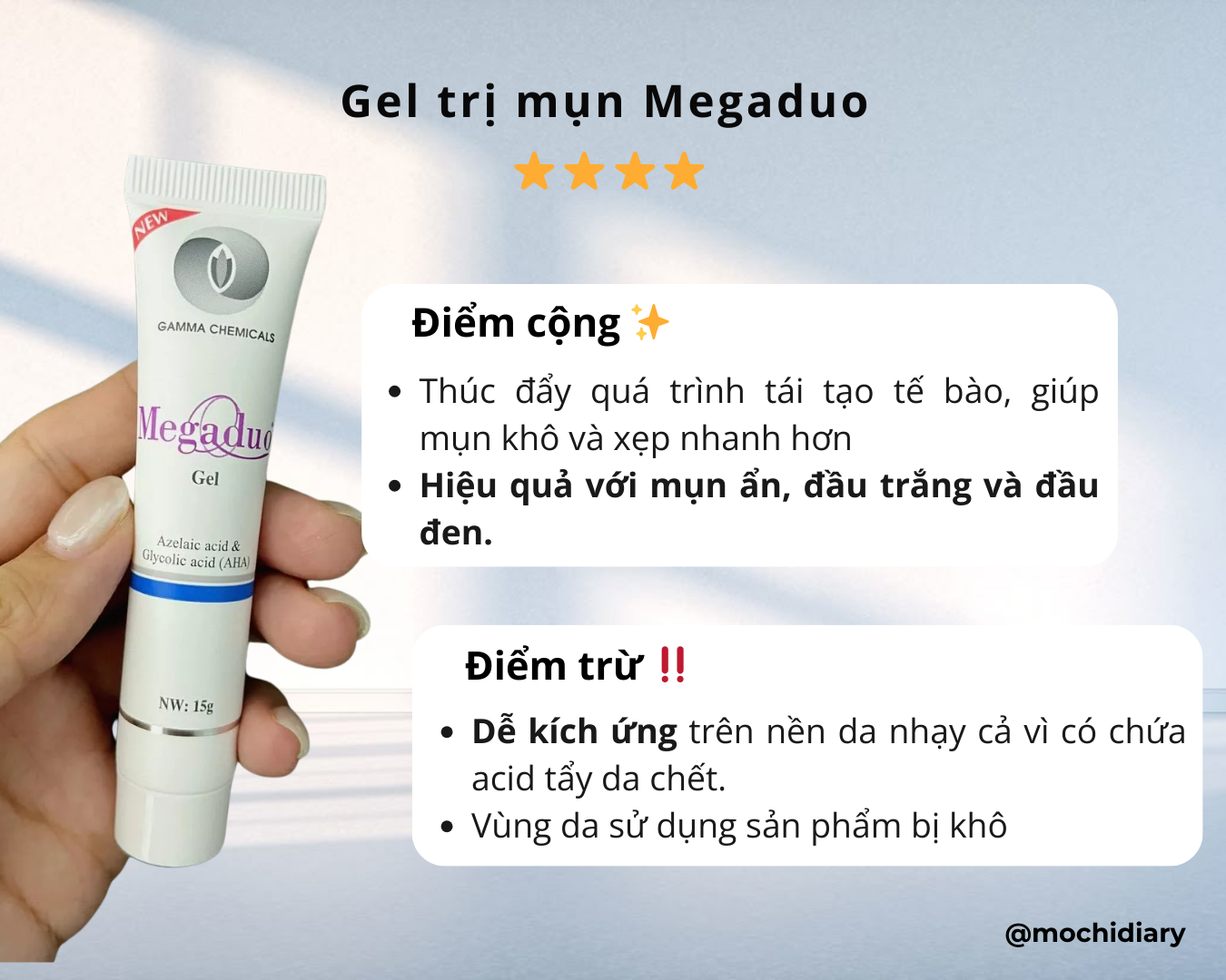 Gamma Megaduo là tuýp trị mụn phù hợp cho làn da cần làm sạch lớp sừng, bã nhờn tích tụ, giúp lỗ chân lông thông thoáng và hỗ trợ làm mờ thâm. Sản phẩm thúc đẩy quá trình tái tạo tế bào, giúp mụn khô và xẹp nhanh hơn, đặc biệt hiệu quả với mụn viêm nhẹ, mụn đầu trắng và mụn đầu đen. Do chứa acid tẩy da chết, người có da nhạy cảm nên bắt đầu với tần suất thấp để hạn chế nguy cơ kích ứng.