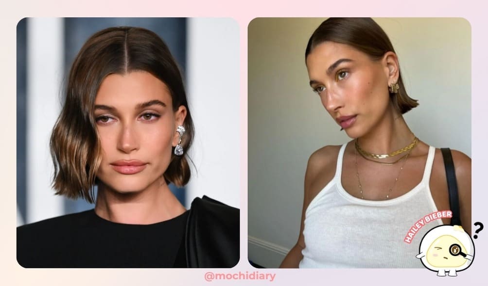 Hailey Bieber – Hailey nổi tiếng với phong cách bob ướt đơn giản nhưng tinh tế, thường kết hợp với kiểu rẽ ngôi giữa.