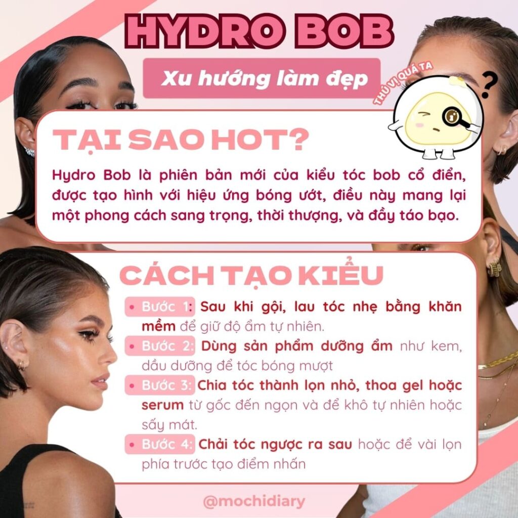 Hydro Bob là phiên bản mới của kiểu tóc bob cổ điển, được tạo hình với hiệu ứng bóng ướt, điều này mang lại một phong cách sang trọng, thời thượng, và đầy táo bạo.