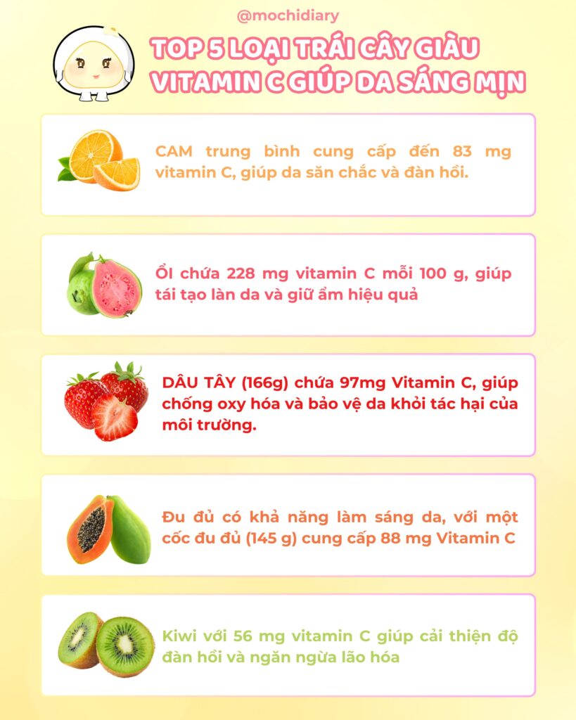 Cùng Mochi tìm hiểu qua 5 loại trái cây chứa lượng Vitamin C dồi dào giúp cải thiện làn da hiệu quả dưới đây nha: