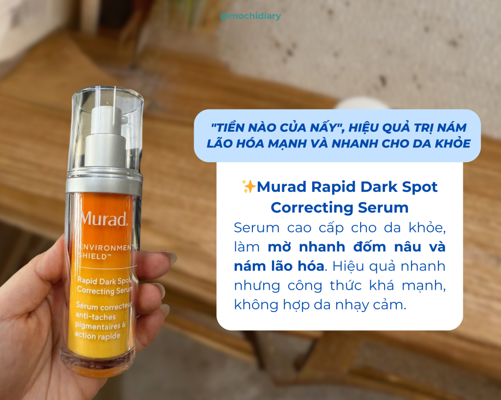Đúng như cái tên “Rapid”, dòng serum nám của Murad mang lại hiệu quả mờ nám nhìn thấy được chỉ sau 2-3 tuần. Công thức chứa phức hợp Resorcinol, Tranexamic Acid và Glycolic Acid nồng độ cao tấn công dồn dập vào sắc tố melanin, đóng vai trò như một loại serum trị nám tàn nhang hoạt tính mạnh.