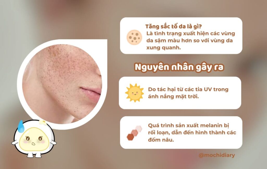 Tăng sắc tố da là tình trạng xuất hiện các vùng da sậm màu hơn so với vùng da xung quanh. Nguyên nhân chính gây ra tình trạng này là do việc sản xuất quá mức melanin – sắc tố tự nhiên tạo màu cho da. Melanin được sản sinh để bảo vệ da khỏi tác hại của tia UV, tuy nhiên, khi tiếp xúc quá nhiều với ánh nắng mặt trời hoặc các yếu tố kích ứng khác, quá trình sản xuất melanin có thể bị rối loạn và quá nhiều, dẫn đến sự hình thành các đốm nâu, nám, tàn nhang…
